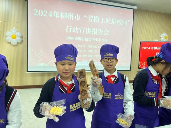 12月11日,在柳州市柳石路第四小学阶梯教室,200多名师生代表聆听了这场宣讲。薛春雄出生于百年制饼世家,2013年创建广西第一家以糕饼为主题的柳州市桂饼文化博物馆,收藏各时期的精美制饼模具9000余件,挖掘保护传承制饼技艺200多种,得到各界的广泛好评。“柳州锦桂楼礼饼制作技艺”列入自治区非遗名录。本次宣讲,薛春雄以“匠心坚守百年品质”为主旨向同学们介绍了锦桂楼从家庭作坊到企业化生产的发展史、桂饼文化起源,并把柳州味道与传统面点相结合,不断创新发扬的奋斗故事。现场通过生动的讲解和精心准备的研学互动,带领学生们沉浸式体验绿豆饼制作工艺,使“传承饼道,留住手艺”的匠心和初心镌刻在每个同学的心中。