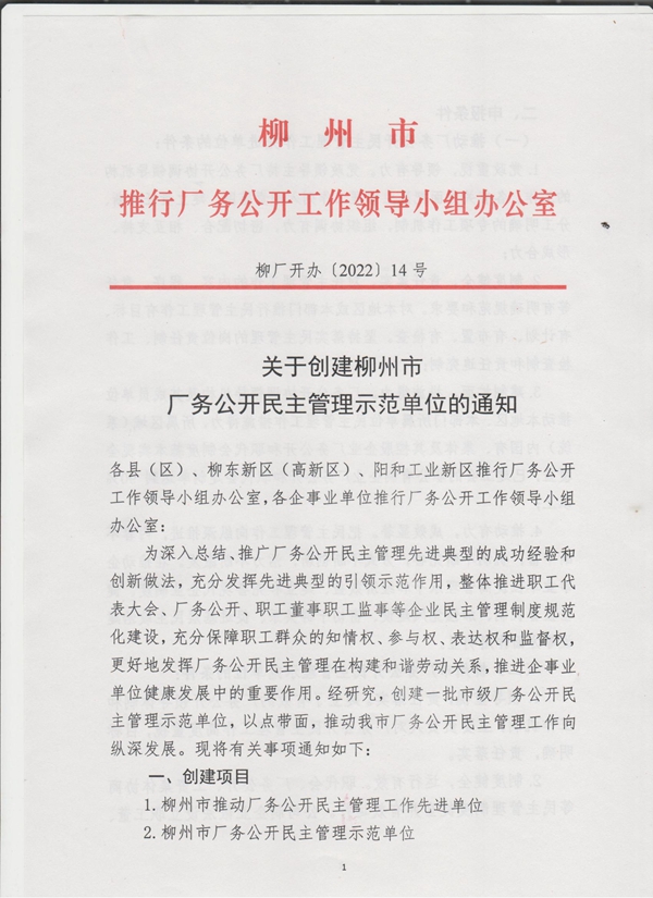 柳厂开办〔2022〕14号 关于创建柳州市厂务公开民主管理示范单位的通知