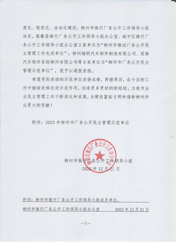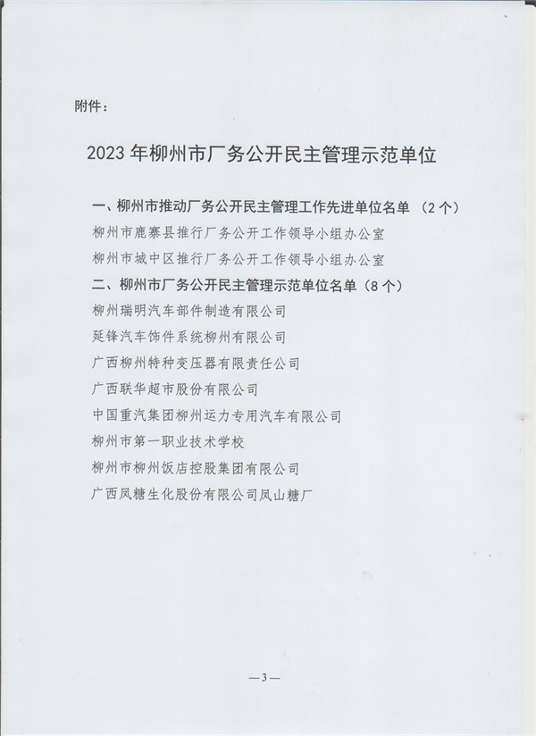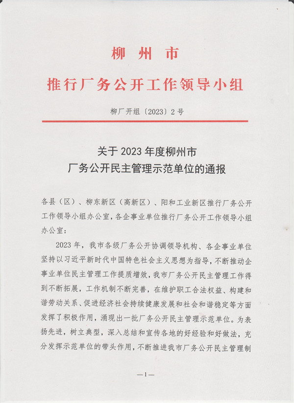 柳厂开组〔2023〕2号 关于2023年度柳州市厂务公开工作示范单位的通报
